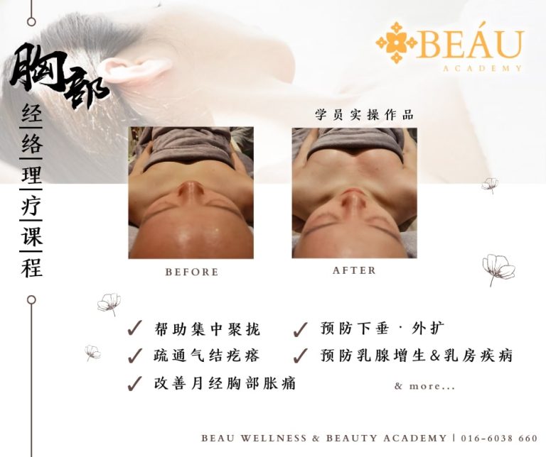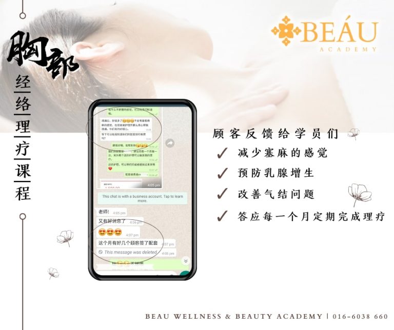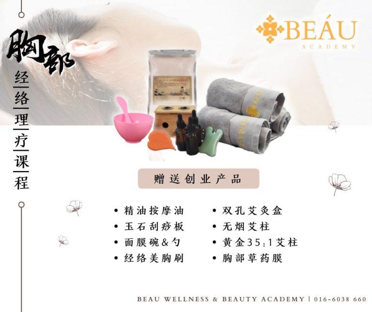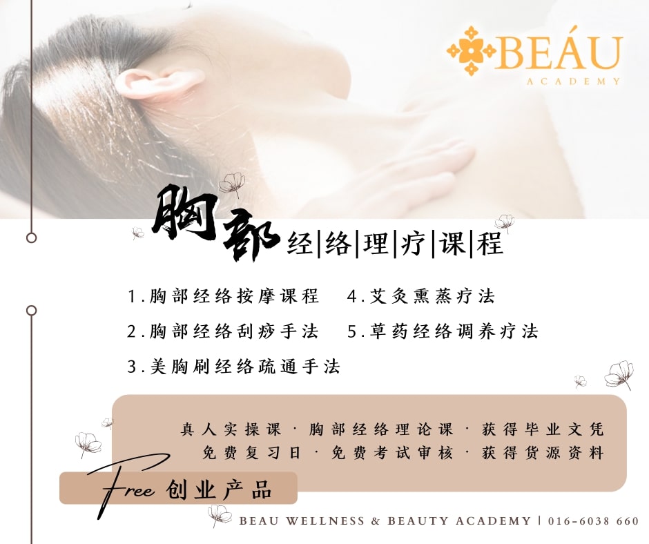 胸部经络按摩与刮痧疗法课程 自古以来,胸部就是女人美丽的象征。它不仅是女人最贵的房子。房子需要装修美化,女人的胸部更应该多重视,多保养,做一次胸相当于打一支抗衰针,可以通九条经络。每位女性都希望拥有一对挺拔丰满的乳房,但是乳房疾病的日益增多向我们昭示乳房保健的重要性。那么,如何进行有效保健呢?我们的课程会教你如何协助女性聚龙美胸! 适合人群 美容院,产后月子中心,SPA馆,女性养生理疗馆,想帮助更多女性,有兴趣者,想创业的人 课程特色 包含真人实操课&相关理论课考试通过后,能够获取学院文凭不限上课次数包含课程耗材提供货源链接接受6期分期付款 我要报名这课程! 课程简介 顾客给学员的好评 帮助女性拥有完美胸部: 聚拢美胸美化胸型美容抗衰预防下垂养生保健排毒净化驱寒除湿排风 压力大人士 提升各器官机能 淋巴阻塞 气血循环 乳腺增生问题 乳腺阻塞问题 催乳塞奶排奶石头奶舒缓乳腺胀痛预防乳腺炎症 名额有限,马上报名! 胸部经络按摩与刮痧疗法课程 现在开始上课,马上让顾客体验! 包含真人实操课&相关理论课考试通过后,能够获取学院文凭不限上课次数包含课程耗材提供货源链接接受6期分期付款免费创业产品免费复习班免费体验护理赠送咨询顾客参考表 课程原价 RM 1,888 现在只要 RM 1,288 马上加入课程